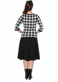 With Check Me, we can also enjoy this happy pattern on colder days, because her mix of viscose and nylon makes her so incredibly cozy. The little v’s at the half long sleeves are a playful wink, and she has a wide neck. This beauty is long enough to be worn above trousers, but can also go lovely with a high waist skirt or trousers.