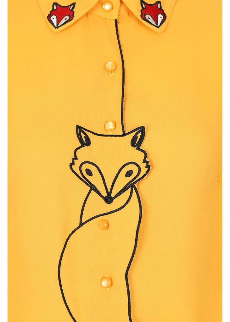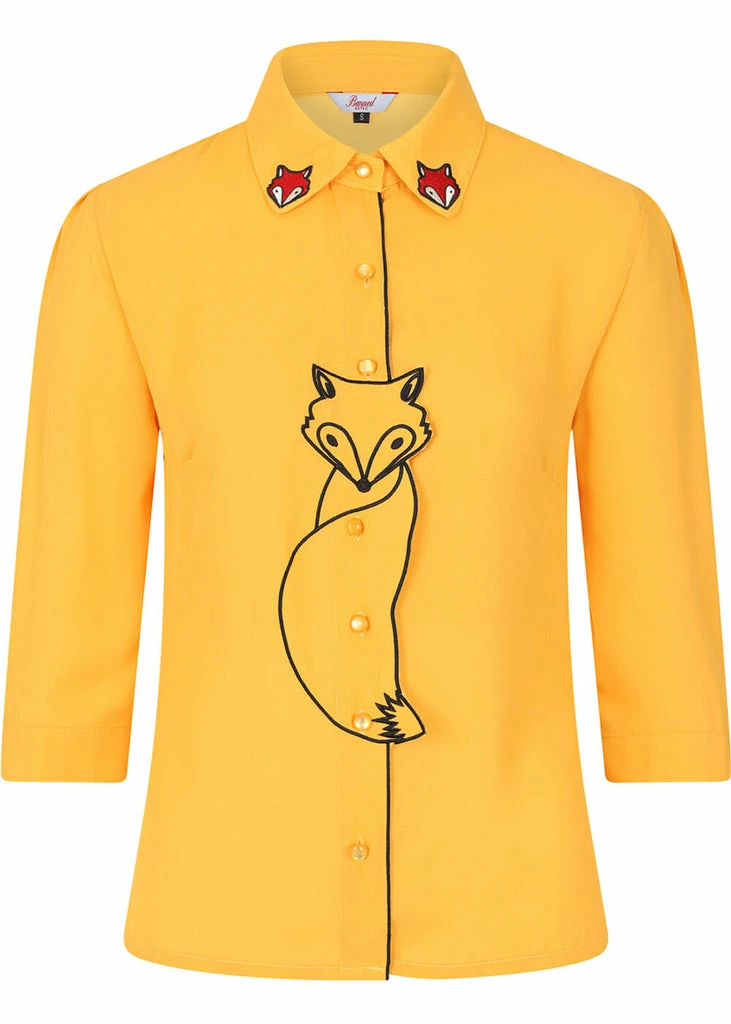 Even the collar is decorated with fox heads, swoon…. She is made of a slightly transparant, soft chiffon with no stretch. She closes with smooth buttons on the front, just like the sleeve ends on the 3/4 sleeves.