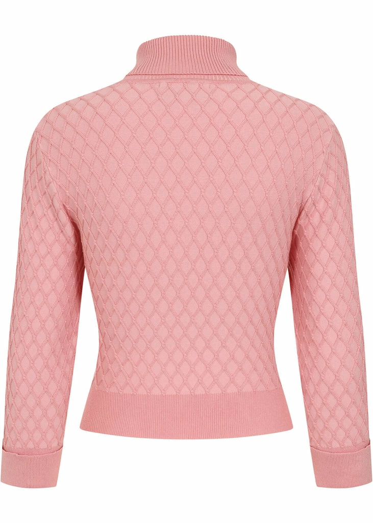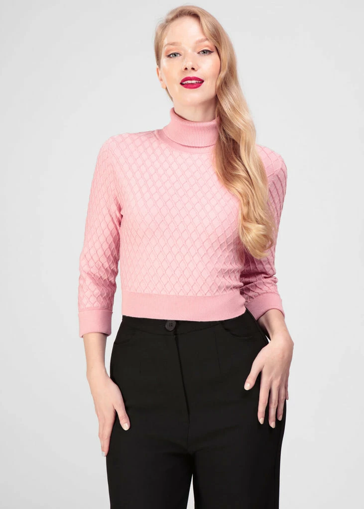 Her high rolled turtleneck and 3/4 sleeves help you stay cozy and warm, while her soft stretchy