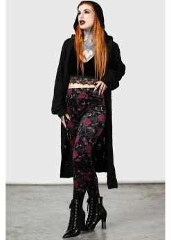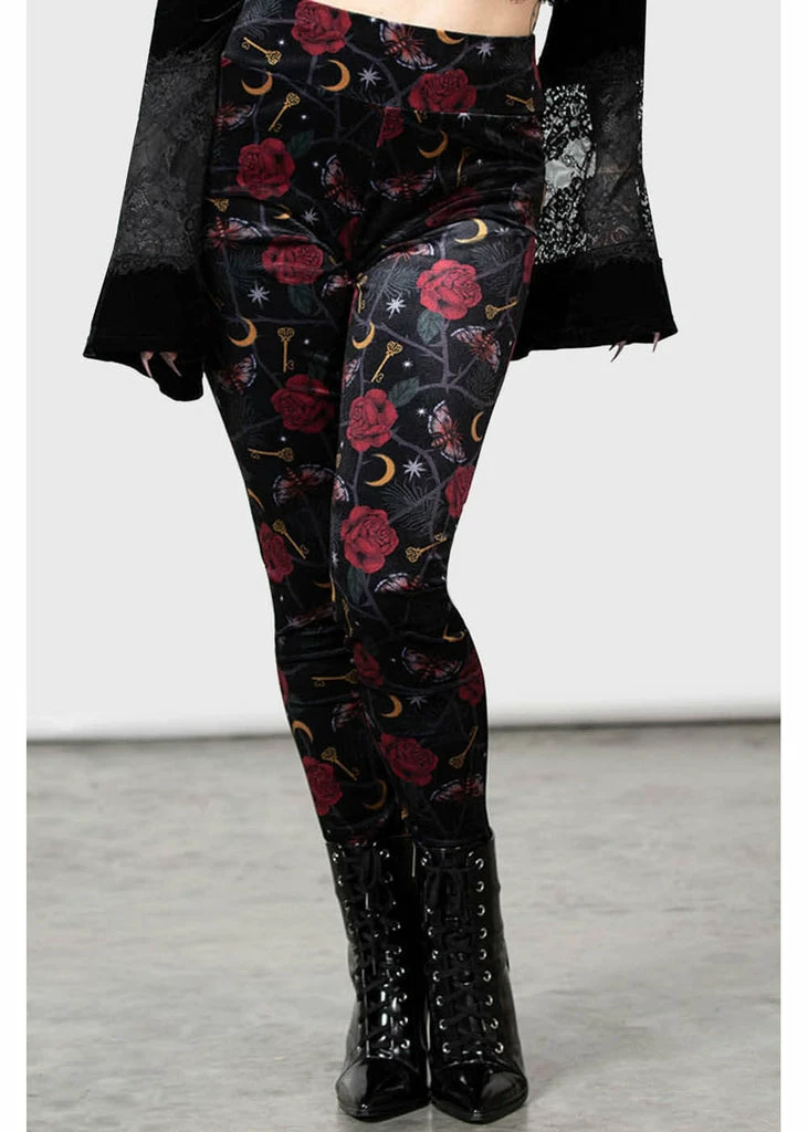 Together with keys and crescent moons, they surround you on the soft velvet… These leggings have fine stretch, which makes them feel like a beautiful nightmare and highlights all your curves deliciously. The waistband is elastic, so you simply slip in and out.