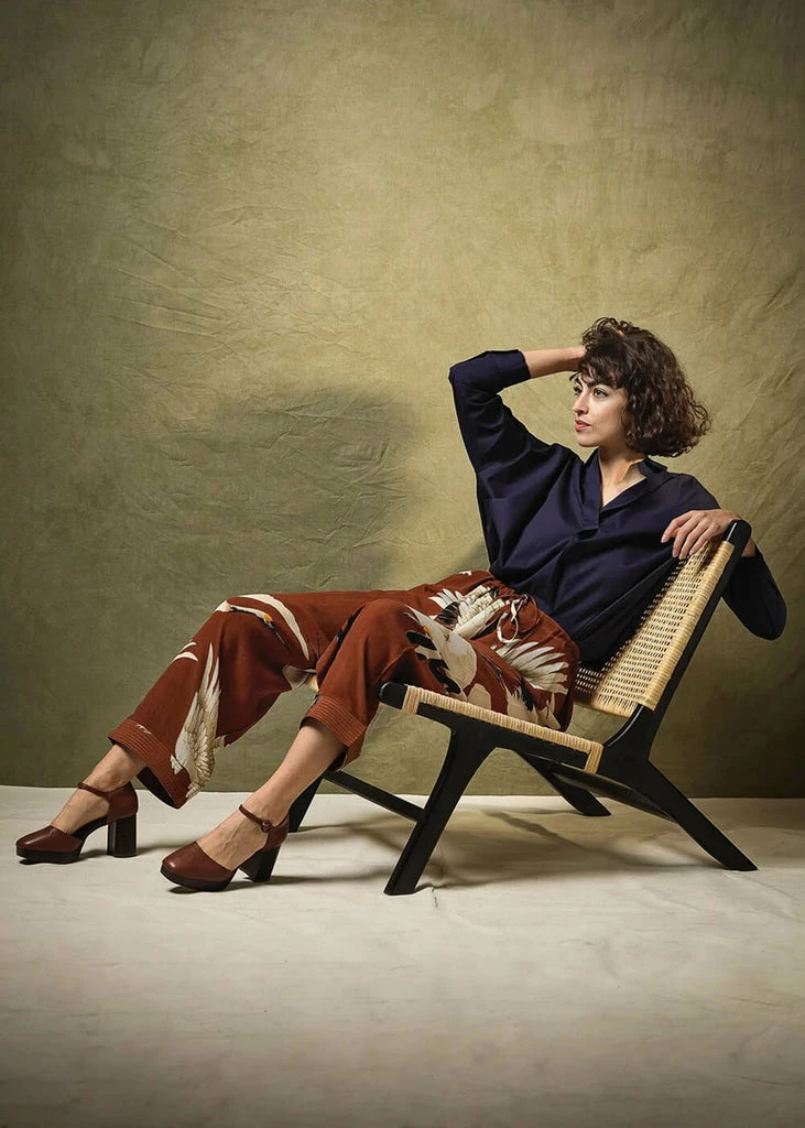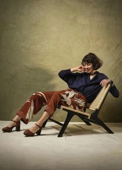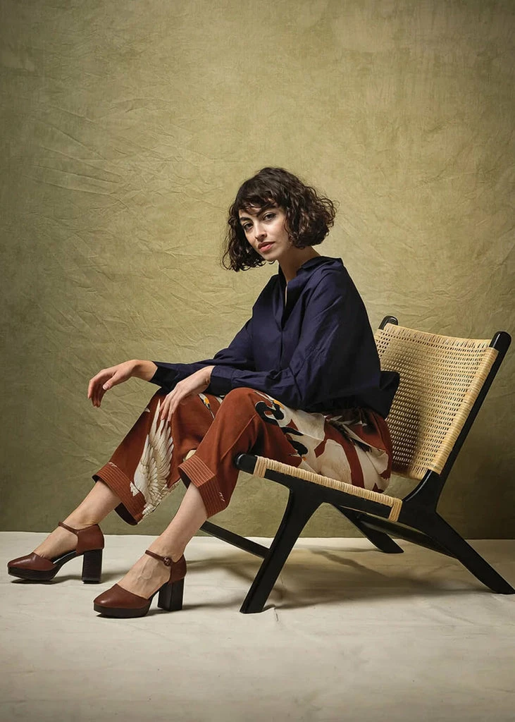 You wear her in the waist, where she closes by tying the laces. She’s made of breathable viscose without stretch, so you get through the summer cool and stylish.