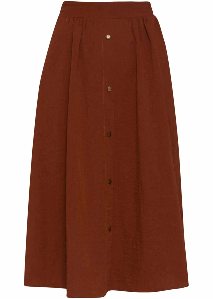 For the warm cognac-brown colours or the playfully shimmering decorative buttons along the front: She is simply stunning! The waistband is elastic in the back, before she flares until below the knees for a length of 1.70m. Super handy: No zipper needed, you can just slip into her!