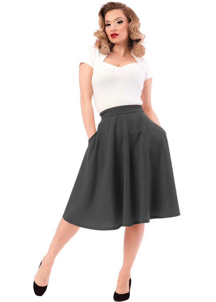 The waistband makes for a classic 50’s silhouette, from where she flaresinto a full skirt with deep pockets! She’s stunning in combination with our